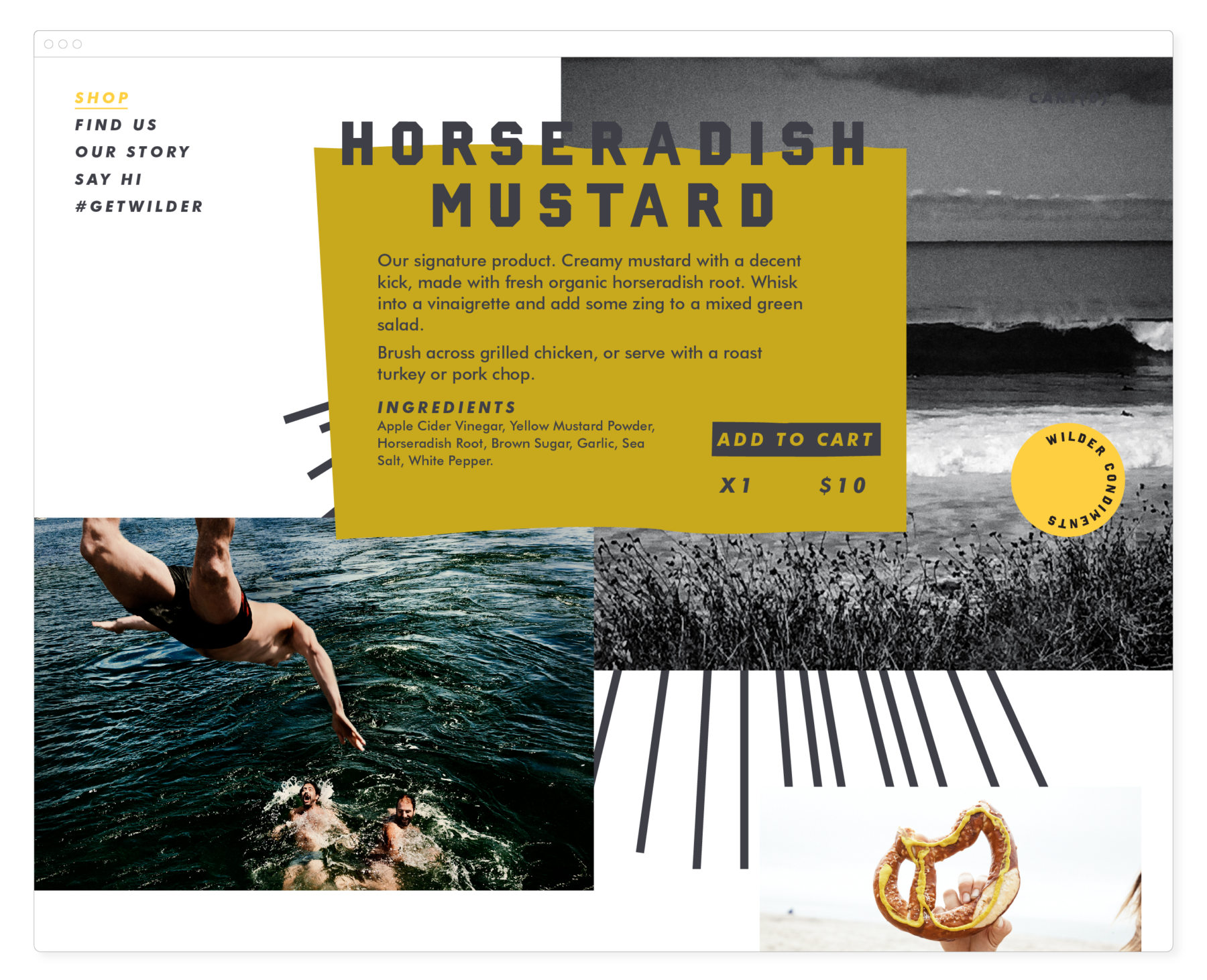 Wilder Condiments are designed, inside and out, to stand apart on any shelf. Individual packaging draws the eye from a distance and rewards closer inspection with whimsical pairing ideas on the label. It’s a look as comfortable in specialty store displays as in crowded grocery aisles.